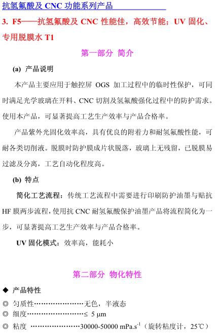 F5——抗氫氟酸及CNC性能佳,高效節(jié)能;UV固化、專用脫膜水固化、專用脫膜水T1