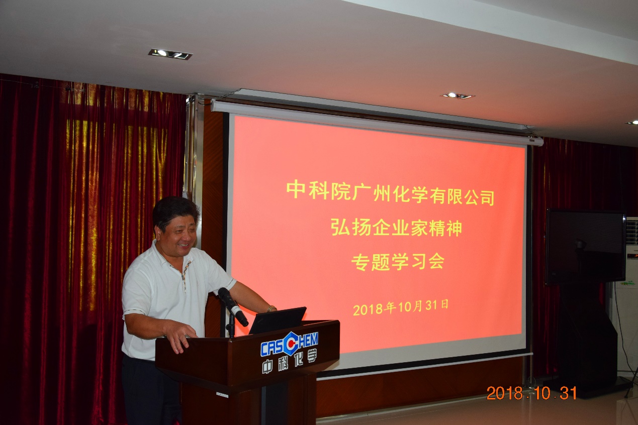 會上,廣州化學黨委書記、董事長胡美龍以《大力弘揚企業(yè)家精神加快推進企業(yè)新發(fā)展》為主題做專題報告,他結合廣州化學的發(fā)展歷程、各業(yè)務板塊發(fā)展規(guī)劃以及企業(yè)文化建設等,從“擔當是本質”、“創(chuàng)新是靈魂”、“冒險是天性”、“合作是精華”、“敬業(yè)是動力”、“學習是關鍵”、“執(zhí)著是本色”、“誠信是基石”八個方面內容進行了分享。他要求參會人員統(tǒng)一思想認識,深入領會落實習近平新時代中國特色社會主義思想和習近平在全國國有企業(yè)黨的建設工作會議上的講話精神,積極貫徹落實《中共中央 國務院關于營造企業(yè)家健康成長環(huán)境弘揚優(yōu)秀企業(yè)家精神更好發(fā)揮企業(yè)家作用的意見》的文件精神,弘揚促進企業(yè)發(fā)展的正能量,團結一致、堅定決心做大做強做優(yōu)廣州化學。