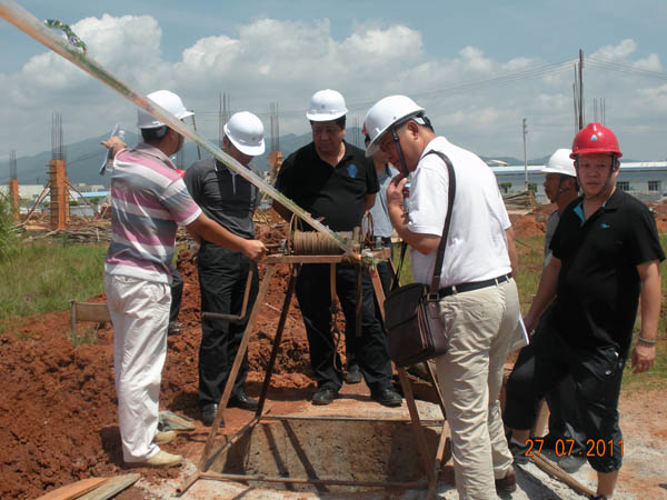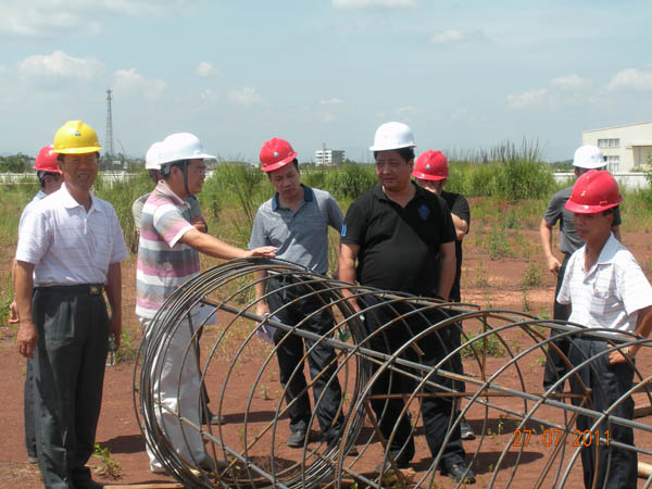 胡美龍一行在南雄市招商辦、南雄精細(xì)化工基地管理處相關(guān)同志以及我公司派駐基地項(xiàng)目經(jīng)理的陪同下,首先對(duì)建設(shè)工地現(xiàn)場(chǎng)進(jìn)行了詳細(xì)深入的檢查和了解。工地現(xiàn)場(chǎng)目前已完成生產(chǎn)基地綜合樓、甲乙類生產(chǎn)車間以及相關(guān)配套設(shè)施的大部分挖孔樁的混凝土澆筑,乙類車間已開(kāi)始基礎(chǔ)上面的建筑施工。胡美龍要求在保證安全的前提下盡快完成剩余10條超深挖孔樁的施工,并對(duì)現(xiàn)場(chǎng)的鋼筋籠制作不符合設(shè)計(jì)和質(zhì)量要求的重要環(huán)節(jié)提出了整改要求。