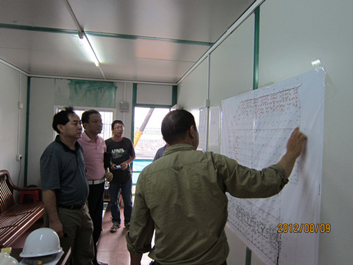 隨后,廖兵一行到中海佛山千燈湖(三期)旋挖樁工地現(xiàn)場(chǎng)檢查建設(shè)工作。他們首先對(duì)建設(shè)工地現(xiàn)場(chǎng)的施工工藝、施工安全和施工管理進(jìn)行了詳細(xì)深入的檢查。之后,聽取了駐地工程項(xiàng)目經(jīng)理的工作匯報(bào)。廖兵指出,現(xiàn)場(chǎng)工作一定要堅(jiān)持“以人為本、安全第一”,嚴(yán)把質(zhì)量安全關(guān),做好工程現(xiàn)場(chǎng)、技術(shù)檔案和施工資料等管理工作。他要求大家把此項(xiàng)目作為化灌公司項(xiàng)目管理的典型來抓,在展現(xiàn)化灌公司先進(jìn)工程施工技術(shù)和工藝的同時(shí),要體現(xiàn)出化灌公司的項(xiàng)目管理水平。最后,廖兵一行對(duì)工程現(xiàn)場(chǎng)施工的員工進(jìn)行了慰問,提醒他們要注意施工安全和防暑降溫,對(duì)他們?cè)谑⑾目崾顨夂蛳碌男燎诠ぷ鞅硎靖兄x。
