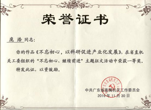 根據(jù)廣東省直機關(guān)工委“不忘初心、繼續(xù)前進”專題征文活動(征文活動)的評審結(jié)果,中科院廣州化學有限公司(廣州化學)龐浩撰寫的《不忘初心,以科研促進產(chǎn)業(yè)化發(fā)展》一文獲得該征文活動一等獎。