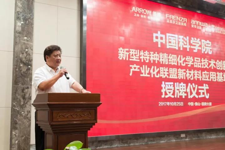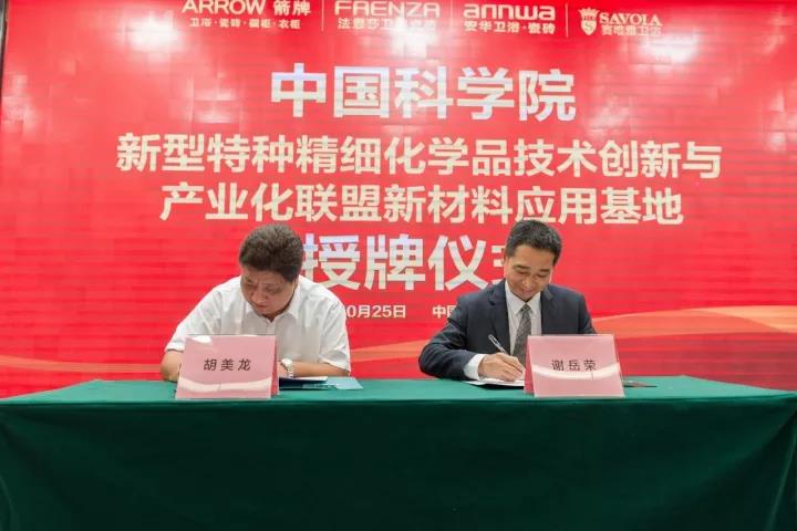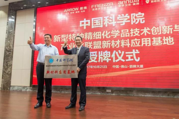 10月25日,在樂華集團箭牌總部大廈,舉辦了“中國科學院新型特種精細化學品技術創(chuàng)新與產(chǎn)業(yè)化聯(lián)盟(精細化學品聯(lián)盟)新材料應用基地”授牌儀式。國科控股董事、總經(jīng)理索繼栓,中科院廣州化學有限公司(廣州化學)黨委書記、董事長胡美龍,廣東省建材協(xié)會會長吳一岳,樂華家居集團董事總經(jīng)理謝岳榮等領導和嘉賓出席了授牌儀式。