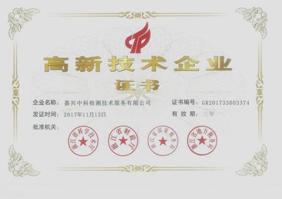 嘉興中科檢測自成立以來,嚴格按照國家《高新技術(shù)企業(yè)認定管理辦法》和《高新技術(shù)企業(yè)認定管理工作指引》的相關(guān)要求,不斷提升自身的研發(fā)技術(shù)實力,壯大研發(fā)及技術(shù)團隊,不斷加強創(chuàng)新能力建設(shè)、強化企業(yè)的科學管理,于2017年底順利通過高新技術(shù)企業(yè)資格評審。