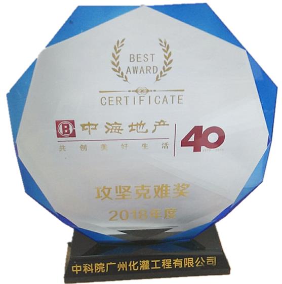 5月17日,在中海地產(chǎn)廣州公司舉辦的2018年度合作商表彰大會上,中科院廣州化學(xué)有限公司控股公司—中科院廣州化灌工程有限公司(化灌公司)榮獲“2018年度攻堅克難獎”。